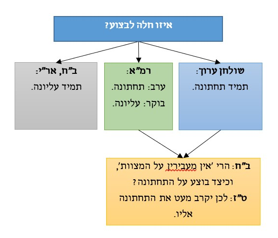 מהשולחן ערוך נראה שאין חילוק בין הסעודות, ולעולם יש לבצוע את החלה התחתונה. לעומת זאת הרמ”א כותב על פי הצעתו, שבערב יש לבצוע את החלה התחתונה ובבוקר את העליונה.