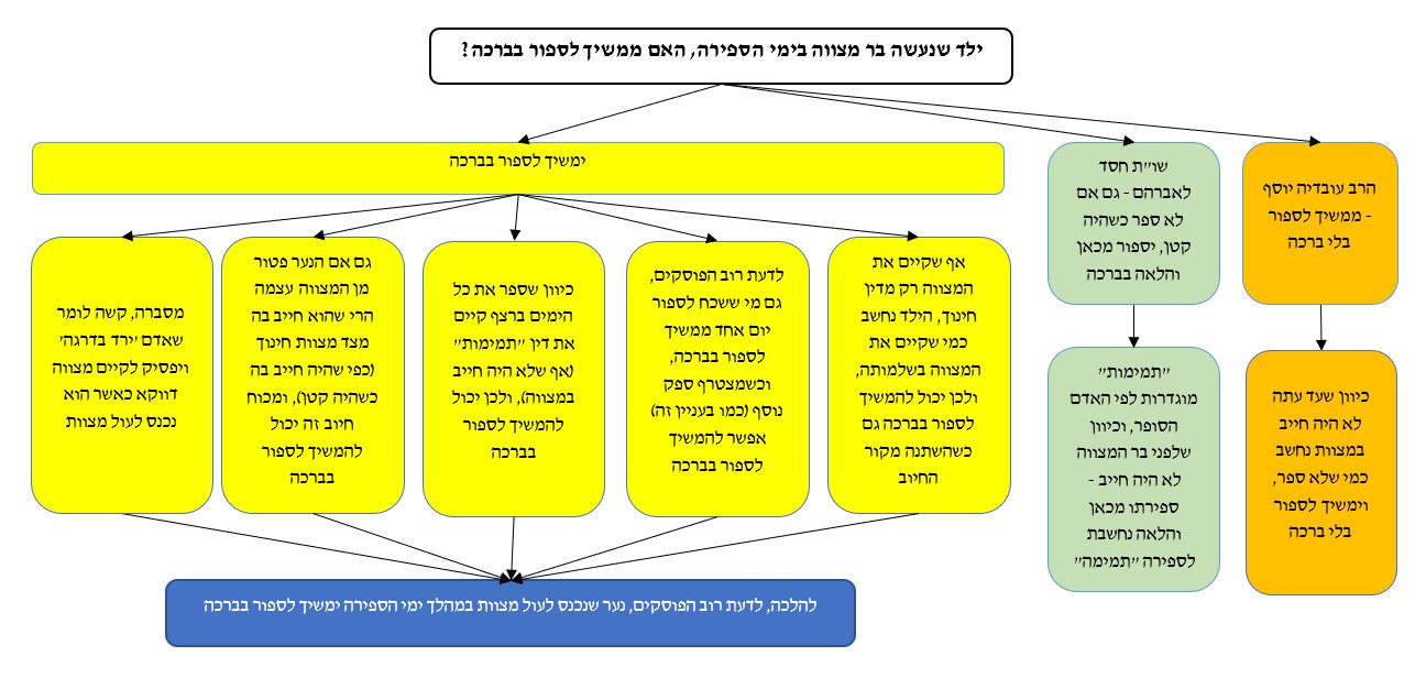 אפשרות אחת היא שכיוון שבימי הספירה הראשונים עד שנעשה בר מצווה, הילד לא מקיים את מצוות ספירת העומר, הרי הוא דומה למי ששכח לספור בימי הספירה הראשונים, ולכן עליו להמשיך לספור בשאר הימים אך בלא ברכה, משום שספק ברכות להקל. וכך פוסק הרב עובדיה יוסף (שו”ת יביע אומר, ח”ג, או”ח סימנים כ”ז-כ”ח; שו”ת יחוה דעת, ח”ג, סימן כ”ט).