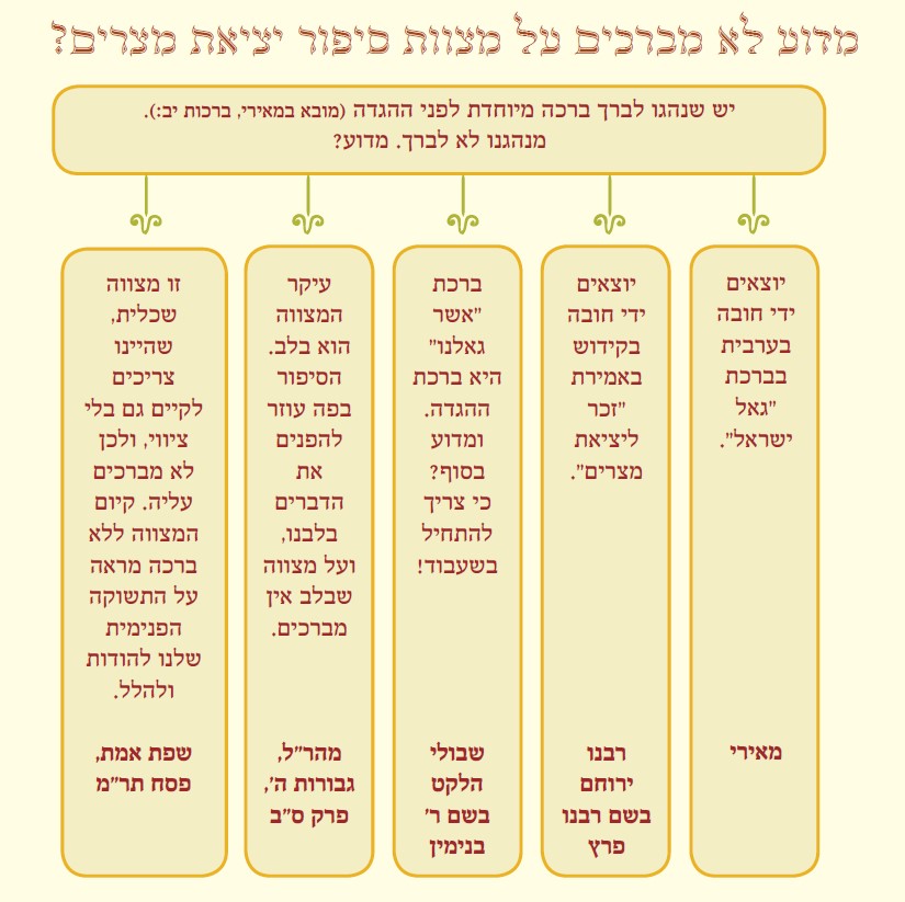 המצווה המרכזית בליל הסדר היא ה’מגיד’, סיפור יציאת מצרים. חלק זה של ההגדה פותח ב”הא לחמא עניא”, ולאחר שאלות הבנים אנו פותחים בסיפור עצמו: “עבדים היינו לפרעה במצרים, ויוציאנו ה’ אלהינו משם…”. היינו מצפים שמצווה חשובה כל כך תהיה מלוּוה בברכת המצוות – “אשר קדשנו במצוותיו וצוונו לספר ביציאת מצרים”. מדוע איננו מברכים על מצווה זו?