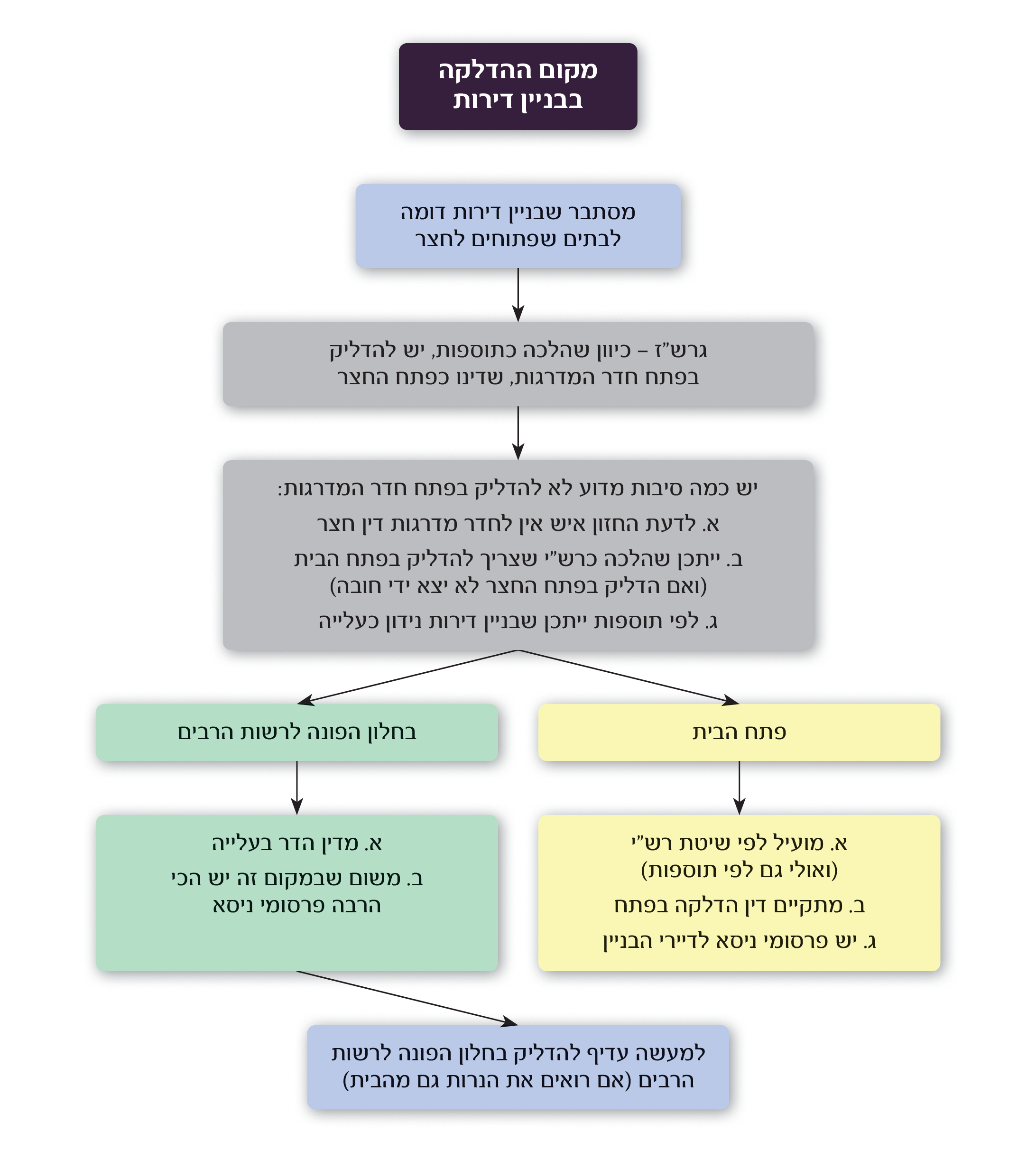 - מצד אחד, פתחי הבתים פתוחים לחדר המדרגות, ולפי זה יש להדליק בפתח חדר המדרגות.
