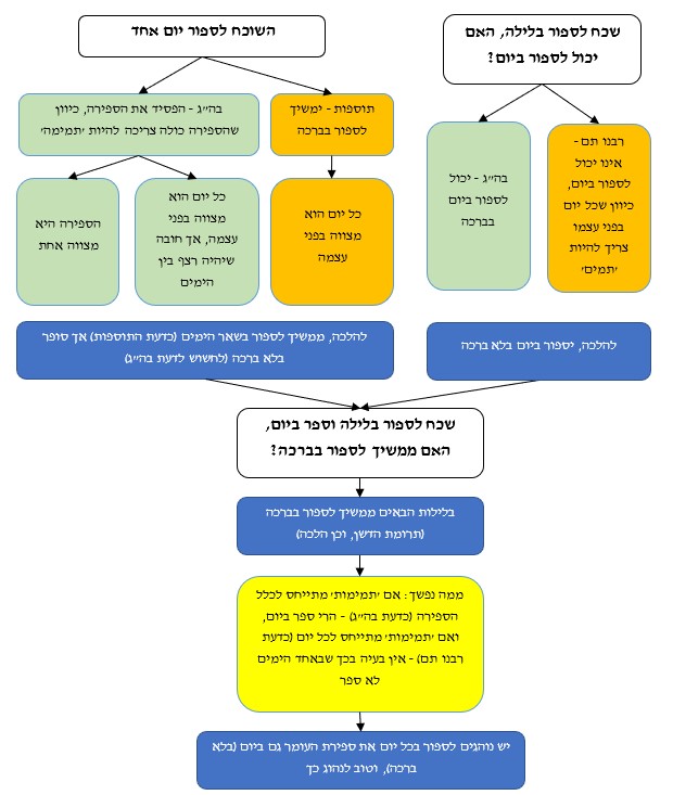 מדברי בה”ג ורבנו תם עולה שהם נחלקו בשאלה על מה נאמר דין ‘תמימות’. לדעת בה”ג, דין ‘תמימות’ מתייחס לכלל הספירה, ולכן לדעתו מי שדילג על יום אחד אינו יכול להמשיך לספור, ועם זאת מי שלא בירך בלילה יכול לברך ביום. לעומת זאת, רבנו תם סובר שדין ‘תמימות’ מתייחס לכל יום בפני עצמו, ולכן מחד, גם מי ששכח לספור באחד מן הימים יכול להמשיך ולספור, ומאידך, מי ששכח לספור בלילה הפסיד את הספירה של אותו יום ואינו יכול לספור ביום.