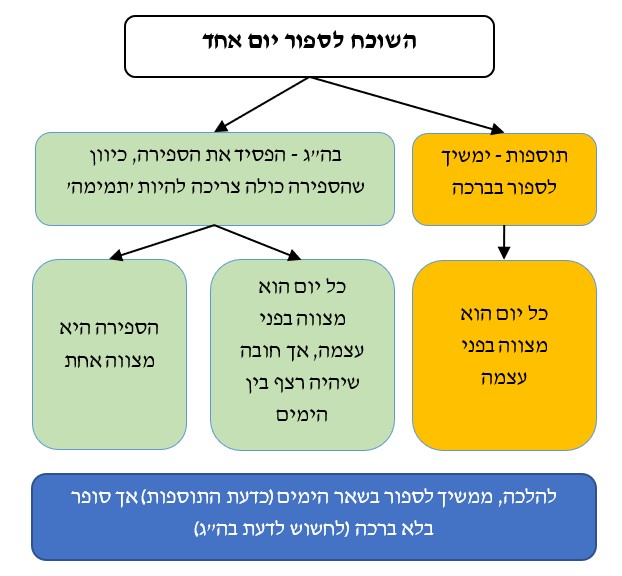כלומר, כיוון שכל יום הוא מצווה, לכן גם אם הפסיק כמה לילות יכול להמשיך ולספור בברכה. לפי זה מסתבר שהמחלוקת בין התוספות לבה”ג היא האם ספירת העומר היא מצווה אחת או שאלו מצוות נפרדות: בה”ג סבור שספירת כל הימים היא מצווה אחת, וצריך לעשותה בשלמות (“תמימות”), ואילו התוספות סבורים שכל יום הוא מצווה בפני עצמה, ולכן גם אם שכח כמה ימים יכול להמשיך ולספור (בברכה).
