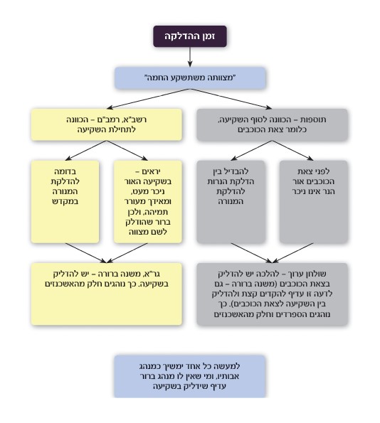 לעומת זאת, מדברי הרשב”א (שבת כא ע”ב ד”ה הא דאמרינן), הר”ן (דף ט ע”א בדפי הרי”ף ד”ה מצותה) והרמב”ם (פ”ד ה”ה) עולה שזמן ההדלקה הוא מתחילת השקיעה, כפי שעולה מפשט לשון הגמרא.