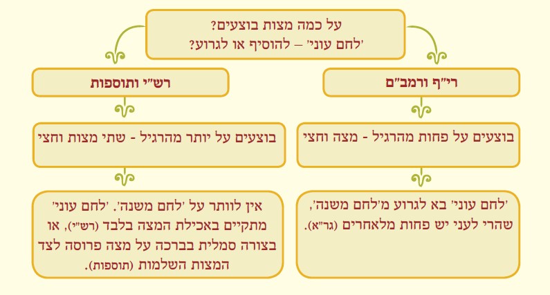 הכל מודים בפסח שכתוב בו ‘לחם עוני’, שמניח פרוסה לתוך שלמה ובוצע בפרוסה, כמו העני שאין לו לחם שלם ובוצע בפרוסה. ודרשינן נמי ‘לחם עוני’, דלא ליבצע אתרתי (=שלא יבצע על שניים) כשאר ימים טובים, אלא ימעט מתרתין שלמין דצריך בשבת וימים טובים.