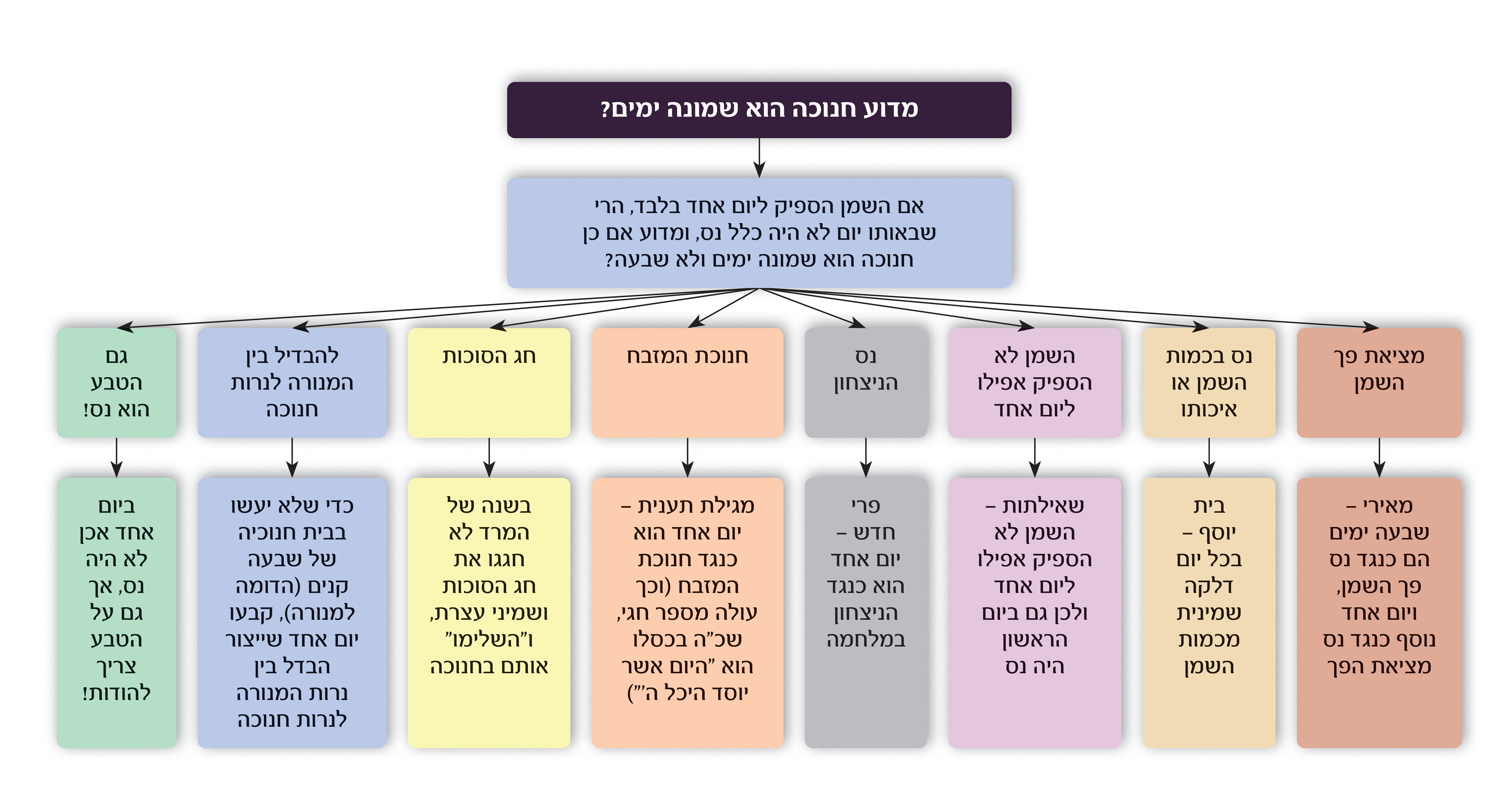 על טעם זה יש לשאול: לכאורה תמוה, מדוע כנגד נס המלחמה תיקנו יום אחד בלבד, וכנגד נס פך השמן תיקנו שבעה ימים? והלא לכאורה נס המלחמה גדול יותר! אלא, שנס פך השמן בא להורות על משמעות נס הניצחון, שגם הוא מאת ה’, והוא אף מחזק אצלנו את ההבנה שהניצחון במלחמה אינו המטרה אלא אמצעי אל החיים שיהיו אחריה – האם נהיה אז, בעולם המשוחרר מגזרות השמד של היוונים, במצב מרומם וטהור יותר? האם נגיע לתובנות גבוהות וקדושות יותר? לכן דווקא כנגד נס פך השמן תיקנו שבעה ימים.