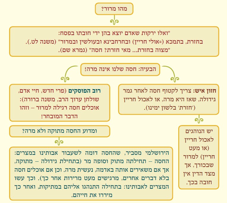 למעשה, הכרעת הפוסקים היא, שהחסה היא המרור המובחר, אף שהיא מתוקה. וכך מבואר בבית יוסף (תע”ג, ד”ה ומה שכתב ועיקר המצוה): “בחזרת, אף על פי שהיא מתוקה”. וכן כתבו הפרי חדש (תע”ג, ה), החיי אדם (ק”ל, ג), שולחן ערוך הרב (תע”ג, ל) והמשנה ברורה (תע”ג, ס”ק מב).