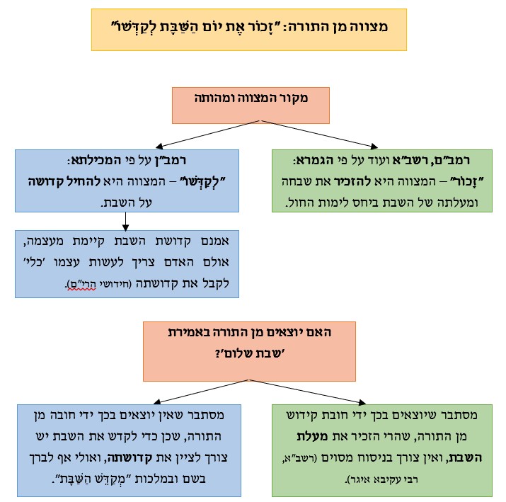 מהו בדיוק עניינה של מצווה זו? כיצד מקיימים אותה מן התורה? הרמב”ם בספר המצוות (עשה קנ”ה) הולך בעקבות הגמרא בפסחים וכתב שמצוַות הקידוש נלמדת מהמילה “זָכוֹר”, ועניינה לזכור ולומר דברים בעניין שבחה של השבת ומעלתה ביחס לימות החול: