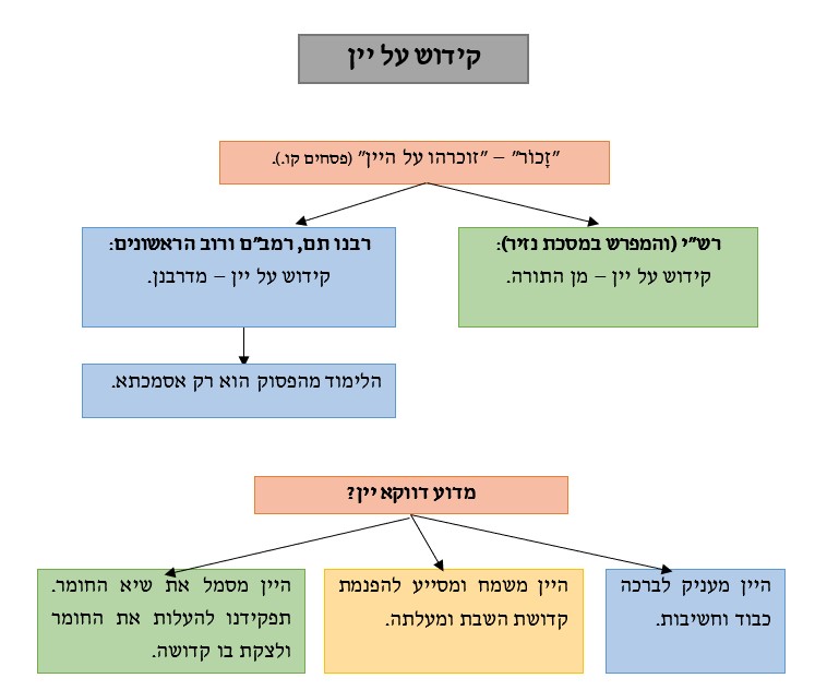 האם החובה לקדש על היין היא מן התורה, או שמא החובה מן התורה היא רק לומר את תוכן הקידוש (שבו עסקנו בפעם הקודמת), ואילו החובה לקדש על היין היא מדרבנן בלבד, והזכרת היין בדרשה היא אסמכתא בעלמא?