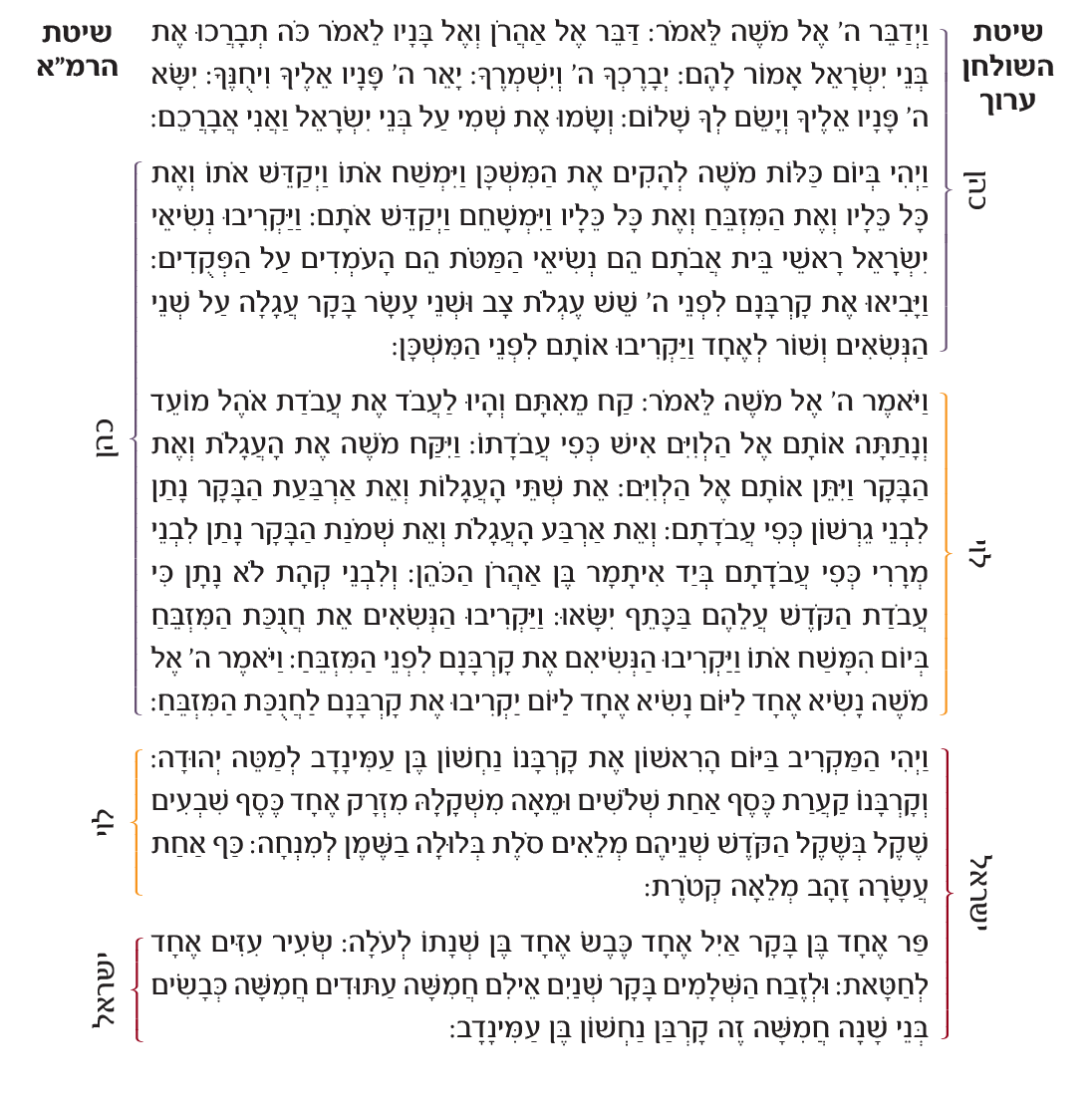 ישנה מחלוקת נוספת בין השולחן ערוך והרמ”א, לגבי חלוקת העולים ביום הראשון. לפי השולחן ערוך (שם) מחלקים את המבוא להקרבת הקרבנות, עד “לחנוכת המזבח” (סוף פסוק יא), לשני חלקים, כיוון שהוא ארוך: לכהן קוראים עד “לפני המשכן” (סוף פסוק ג), וללוי קוראים עד “לחנוכת המזבח”. לשלישי קוראים את הנשיא של היום הראשון.